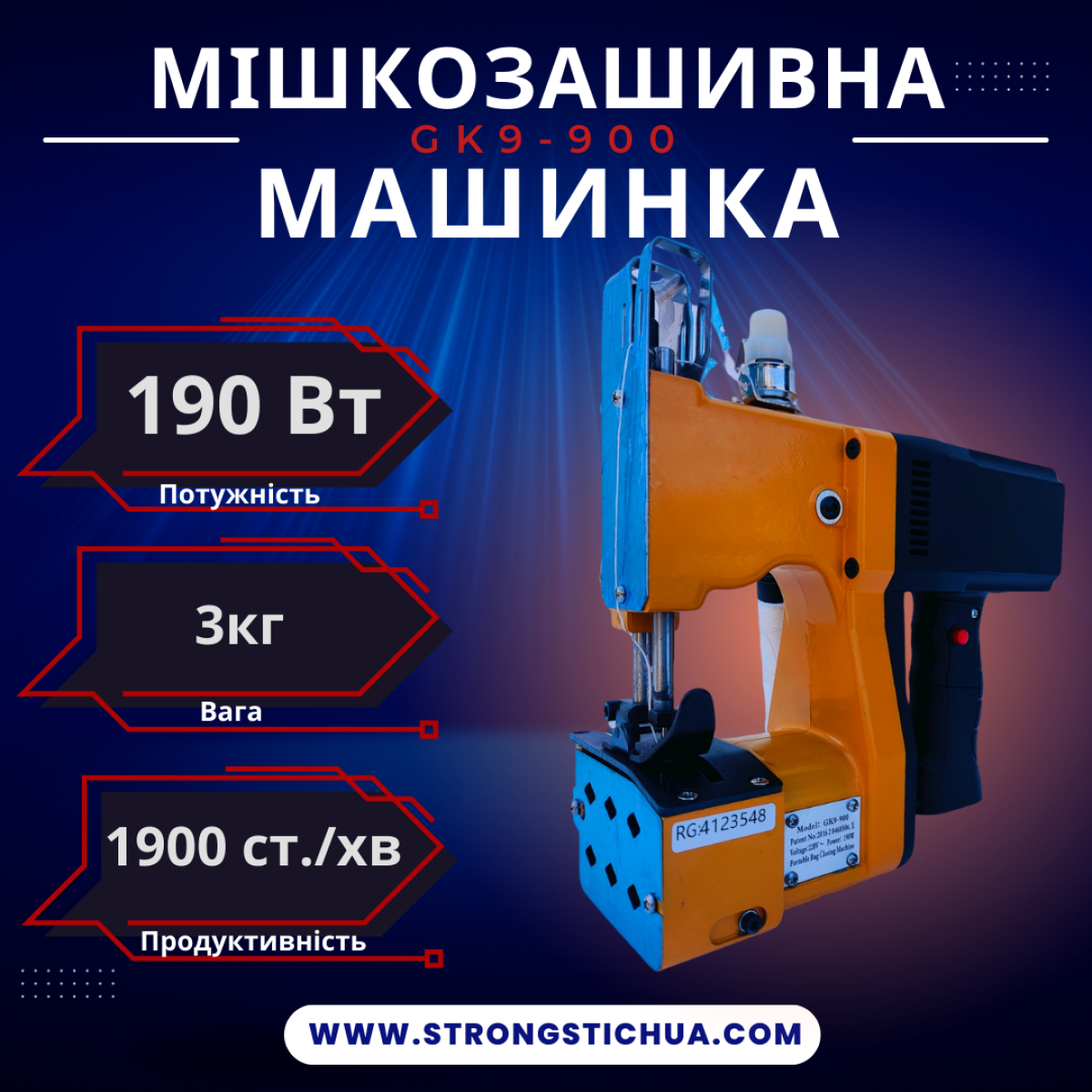 Ручна мішкозашивальна машина GK9-900 характеризується великою мобільністю та простотою використання. Невелика вага цієї моделі дозволяє багато зашивати мішків, при цьому зменшити навантаження на руки. Машина для зашивки мішків має збільшену потужність приводного мотора, посилений зубчастий ремінь, а значить більше продуктивності в роботі.